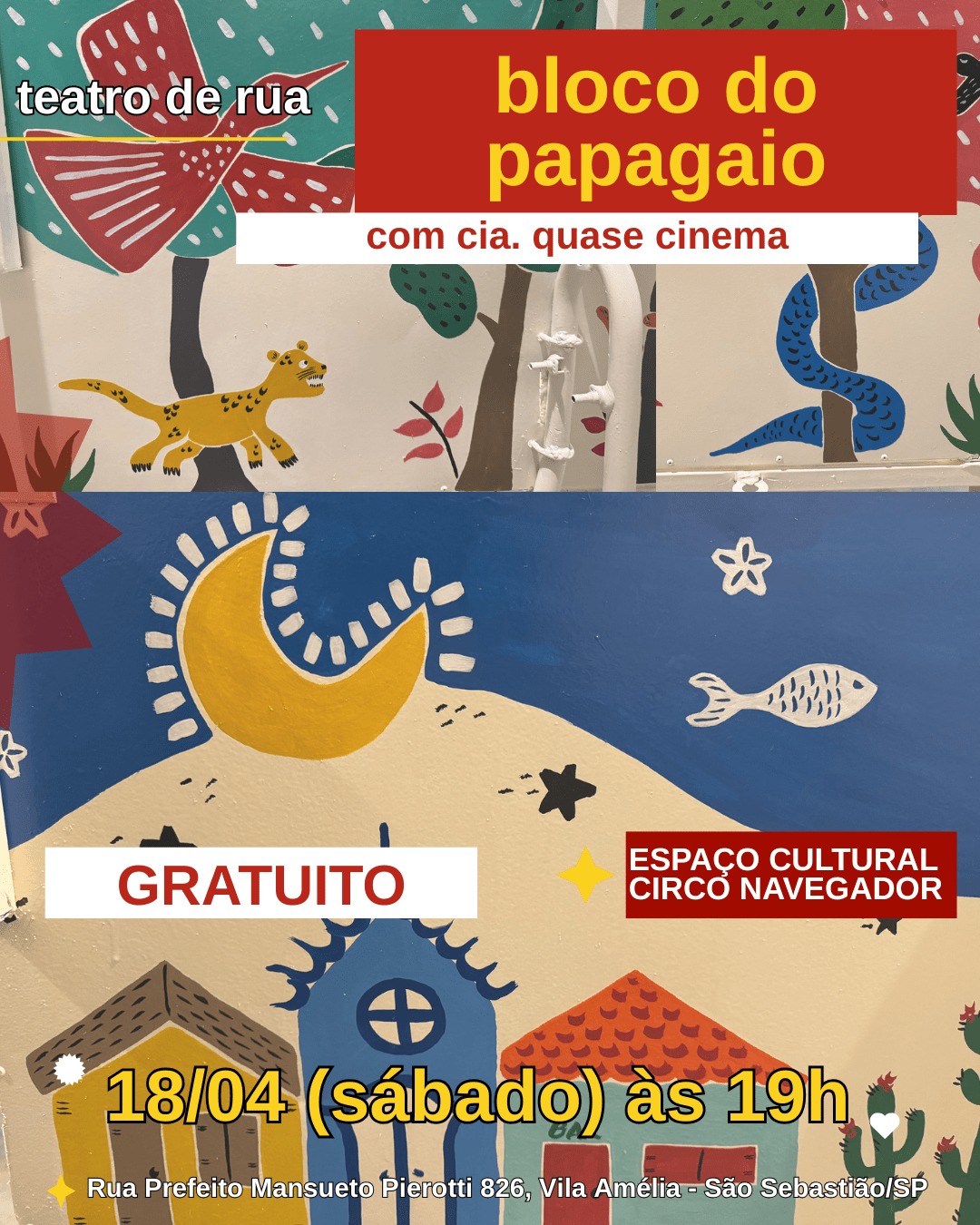 No dia 18/04, às 19h a Cia. Quase Cinema apresenta o Bloco do Papagaio no Espaço Cultural Circo Navegador. O espetáculo de teatro de sombras é inspirado no clássico de Mário de Andrade: