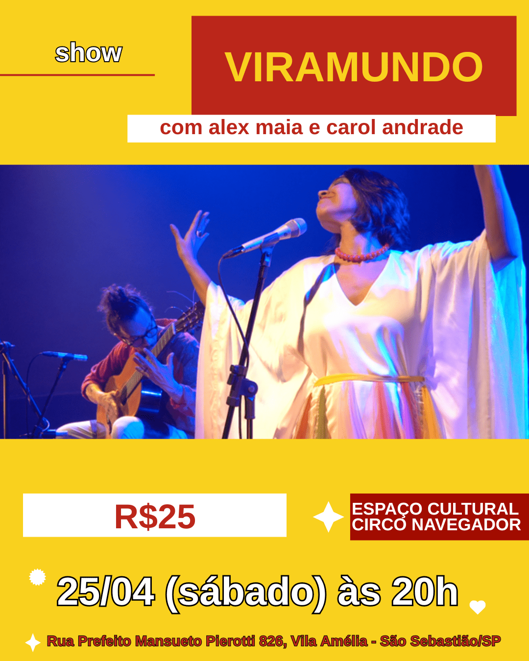 No dia 25/04 (sábado) às 20h, os artistas Carol Andrade (voz) e Alex Maia (violão) trazem ao Espaço Cultural Circo Navegador um show que vai mostrar ao público os bastidores de uma