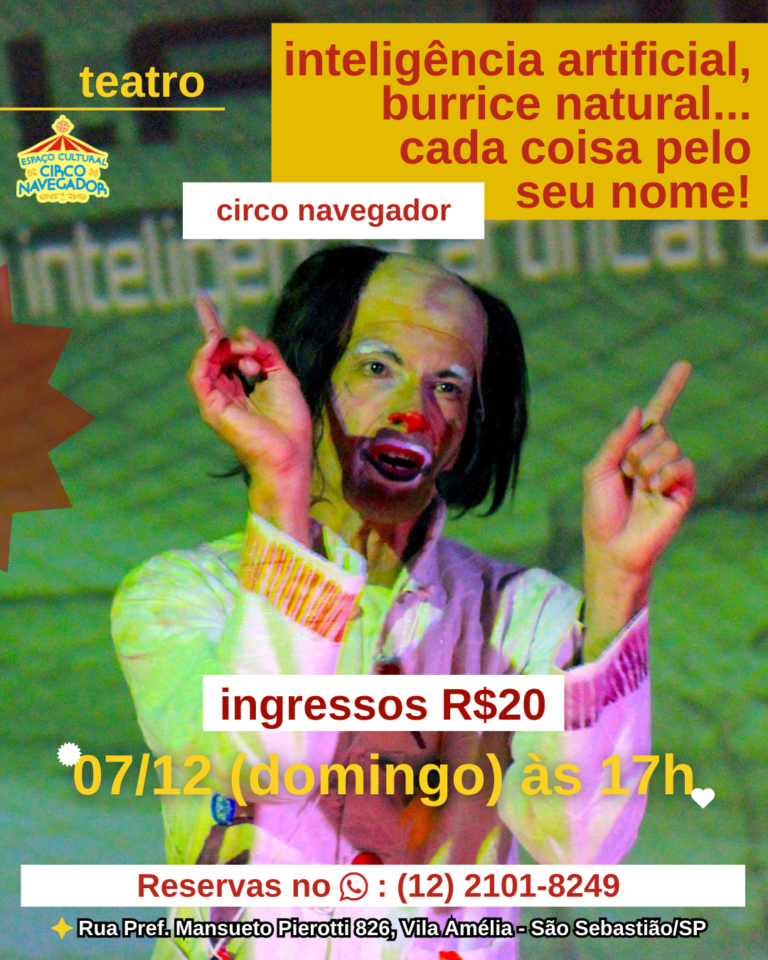 O Espaço Cultural Pés no Chão recebeu o espetáculo “Inteligência Artificial, Burrice Natural… cada coisa pelo seu nome!”, do Circo Navegador. Uma obra que ultrapassa a ideia de simples apresentação artística e se torna uma verdadeira vivência. A forma como a inteligência artificial é abordada na cena é profunda e instigante, despertando reflexões que reverberam muito além do momento do espetáculo. Somos levados a nos questionar sobre até que ponto a tecnologia contribui para a nossa vida e até que ponto ela pode nos afastar de nossa própria humanidade. Um dos momentos mais impactantes é a intensa interação com o público. Cada olhar, cada gesto, cada celular erguido em cena transforma a plateia em parte ativa da narrativa. As projeções, pensadas com riqueza de detalhes, falam tanto com os mais jovens quanto com os mais velhos, costurando referências que atravessam gerações.