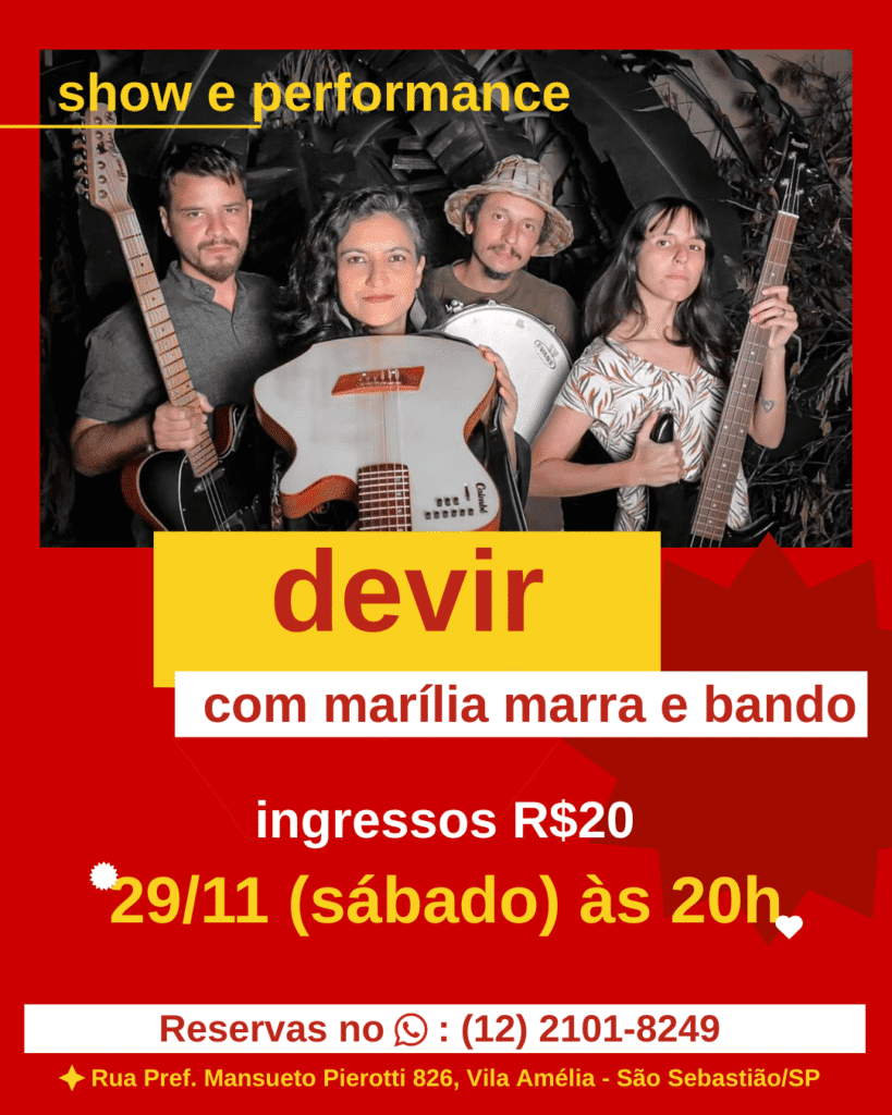 Marília Marra e Bando apresentam o espetáculo“DEVIR”, com música autoral e intervenções de dança e acrobacia.O show é uma imersão poética e musical nesta narrativa do vir-a-ser humano, emforma de canção. Liderado pela compositora, cantora e violonista Marília Marra, ogrupo — formado por Iury Rosa (guitarra), Marcelo Samambaia (bateria) e ArianeSpinelli (baixo e vocais) — cria arranjos coletivos que fundem música brasileira,rock, entre outros estilos, valorizando a palavra, o groove e harmonias nãoconvencionais.No palco, o bando revela uma performance intimista e potente, marcada pela trocaentre os músicos e pela entrega emocional das interpretações. O espetáculo marcaa estreia pública do segundo álbum da artista, “DEVIR”, e conta com intervençõesde dança e acrobacia de Amanda Simonetti, Iaiá Fida, Harlen Mendes e SamyMachado, que traduzem corporalmente a proposta.“DEVIR” é uma experiência sobre a transformação contínua, o movimento entre omicro e o macro, entre o pessoal e o coletivo, onde a canção se afirma comoferramenta de expressão e transformação.Os ingressos promocionais podem ser adquiridos antecipadamente por R$20,00pelo WhatsApp: (12) 2101-8249.